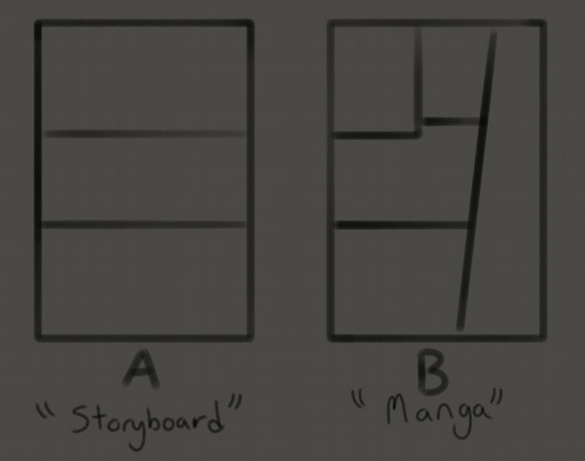 A: "Storyboard" refers to a more classic 'strip' format, similar to those used to storyboard animation. I find this format is especially ideal for scrolling platforms like tumblr, as well as more abstract or lyric based comics.B: "Manga" refers to the type of layouts one might find in manga pages. My style of comic formatting does lean more eastern than western, meaning my pages will not typically fall into the 'rows of boxes' more familiar to classic american comics, which is why I have chosen to label it as "manga". I find this format ideal for specific narrative scenes and character interactions.