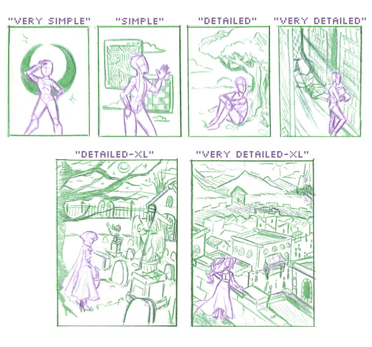 The examples above are some rough thumbnails I made to give a general idea of what I mean by each level of detail/scale!